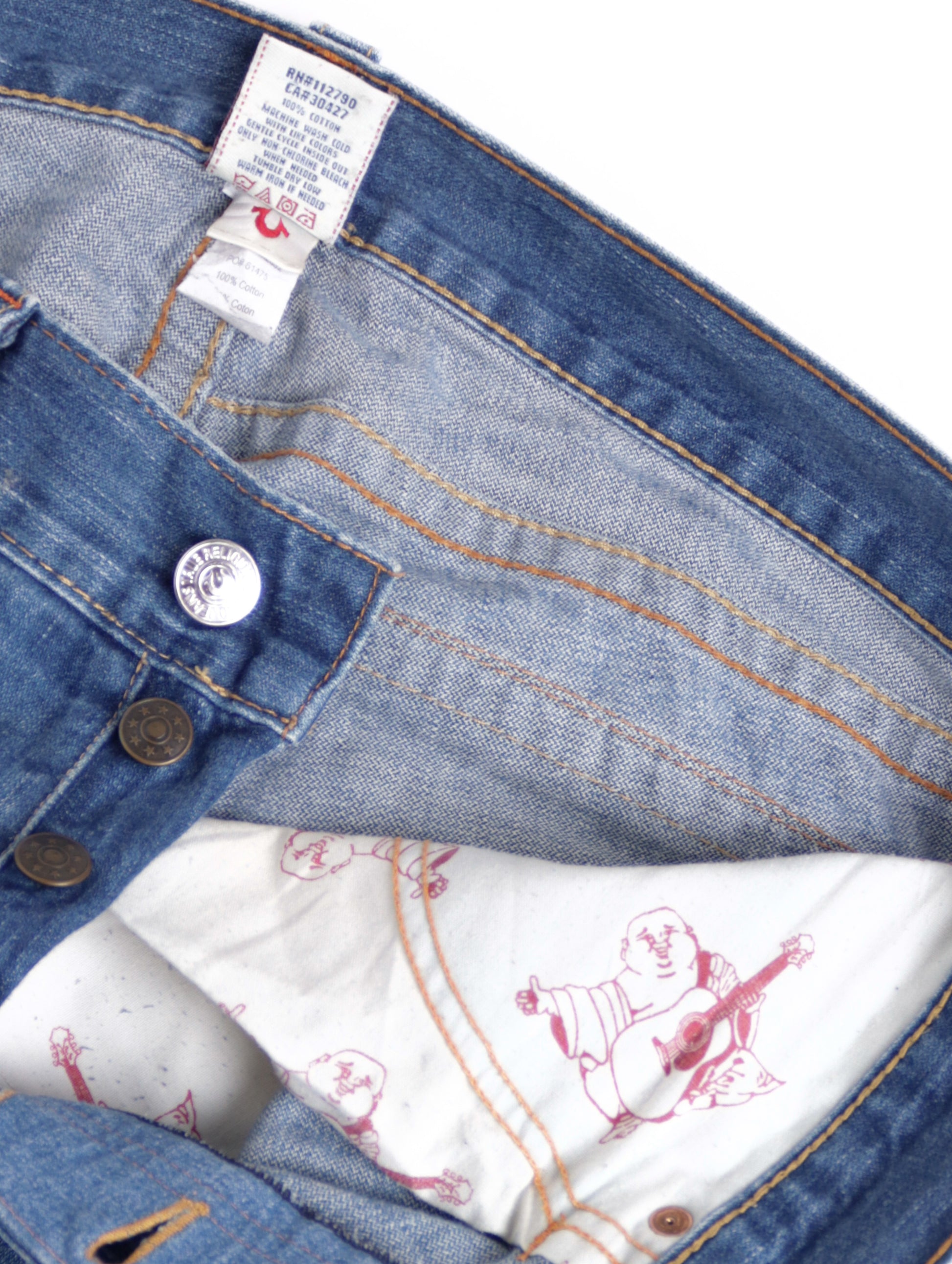 True Religion vintage jeans, original and produced with code RN112790 / CA30427 , in blue denim with contrasting stitching and pockets with flap and buttons. Wide leg model, very popular in Y2K and streetwear style. Internal label indicates ROW 36 / SEAT 34 , but the real measurements correspond to a waist of 50 cm , length 110 cm and wide ankle of 27 cm .