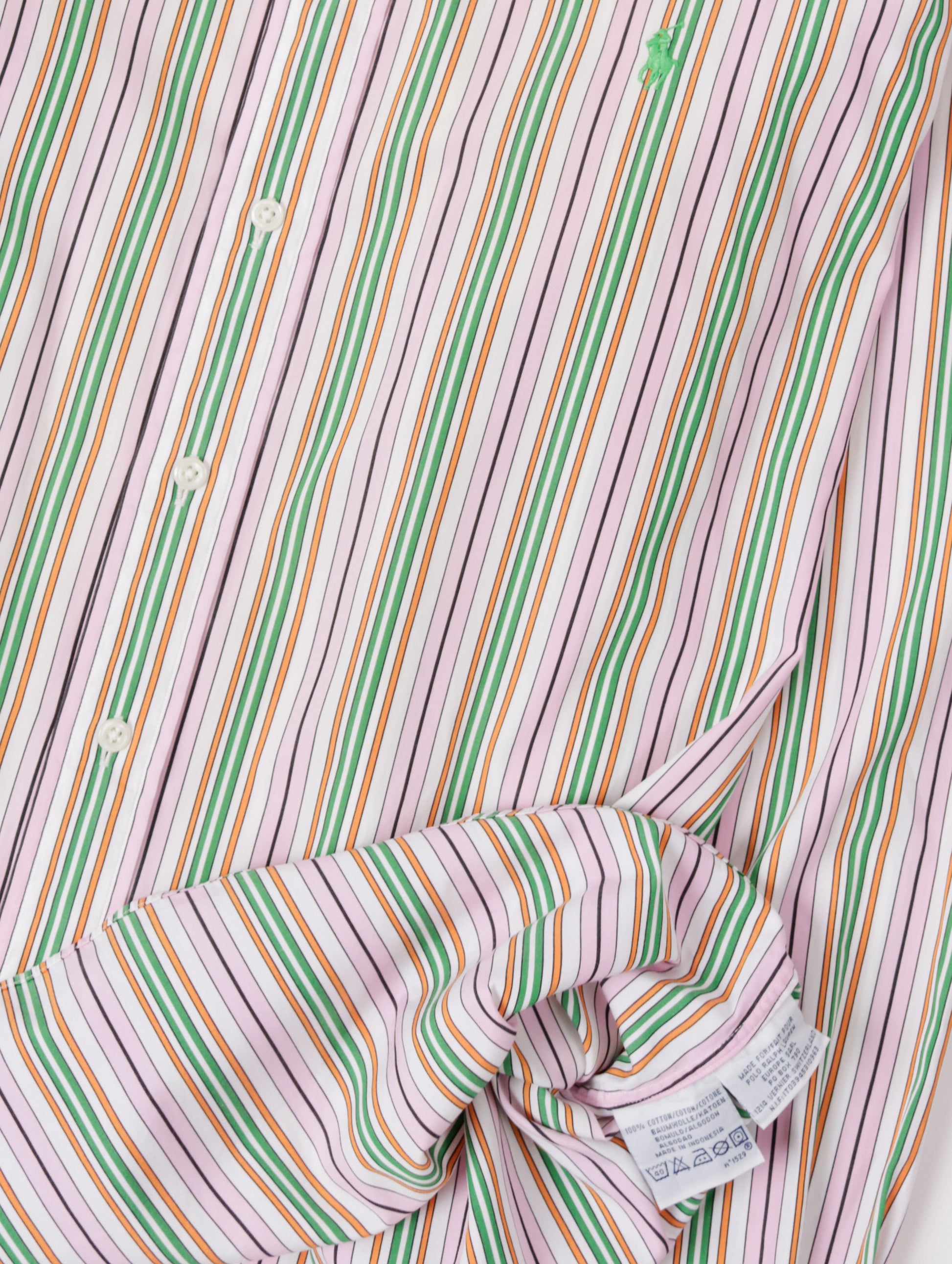 Camicia da uomo firmata Polo Ralph Lauren, caratterizzata da un’elegante fantasia a righe verticali bianche, rosa e verdi. Realizzata in 100% cotone, garantisce comfort e traspirabilità. Modello a manica lunga, taglia XL con vestibilità regolare. Capo in ottime condizioni, senza difetti o segni di usura.